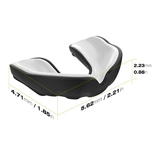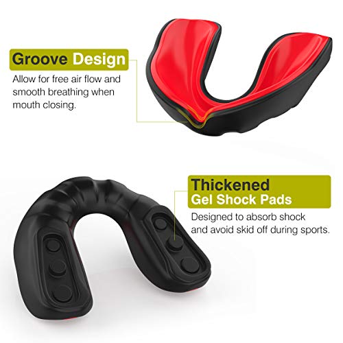 UNIQUE DESIGN – Groove ontwerp zorgen voor vrije luchtstroom en gemakkelijk ademen bij het sluiten van de mond. Houd de ademhaling soepel tijdens de training. Samen met verdikte gel-schokdempers om schokken effectief te absorberen en te voorkomen dat je tijdens het sporten wegglijdt.