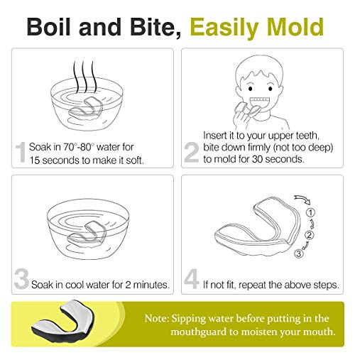 Eenvoudig in gebruik. Verwarm de mondbeschermers in warm water van 70°C – 80°C gedurende ongeveer 15 seconden, vorm om te bijten en snijd de uiteinden voor comfort indien nodig. Geweldig voor zowel jongeren als volwassenen die contactsporten spelen.