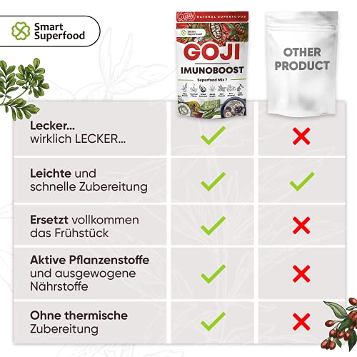 Eenvoudige en snelle bereiding: de mix van superfoods met goji-bessen en cacao is een comfortabele manier om je gezond te voeden, zonder lange voorbereidingstijd. Je hebt gewoon 2 eetlepels nodig in je smoothie of in een kom met yoghurt gemengd en 50-60 g vers fruit en het eten is klaar