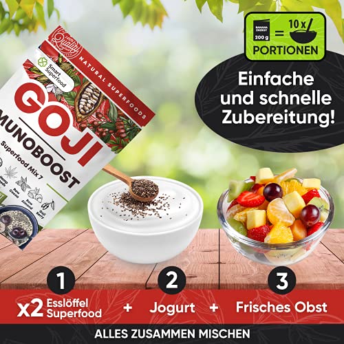 Superfood mix met goji-bessen en cacao is een perfecte gezonde mix die het immuunsysteem ondersteunt. Omdat cacao rijk is aan fytonvoedingsstoffen, maar vet- en suikerarm, zijn de calorieën die je uit cacaopoeder ontvangt, volledig verpakt met gezonde chemicaliën. Goji-bessen bevatten gezonde antioxidanten. Antioxidanten staan bekend om hun immuunversterkende eigenschappen.