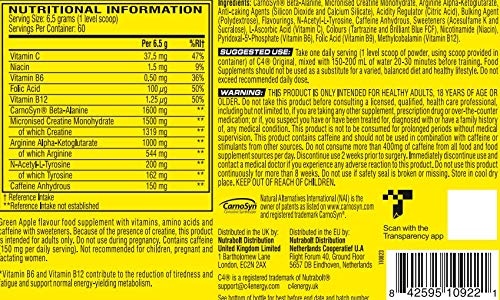 Specification: Pre-workout Powder C4 Original Green Apple | Pre-workout Energy Drink Supplement | 150 mg Cafeïne + Bèta-alanine + Creatine-monohydraat | 60 Doseringen