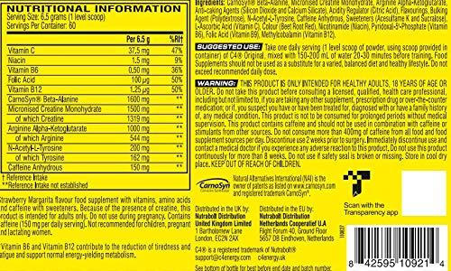 Specification: Pre-workout Powder C4 Original Strawberry Margarita | Pre-workout Energy Drink Supplement | 150 mg Cafeïne + Bèta-alanine + Creatine-monohydraat | 60 Doseringen